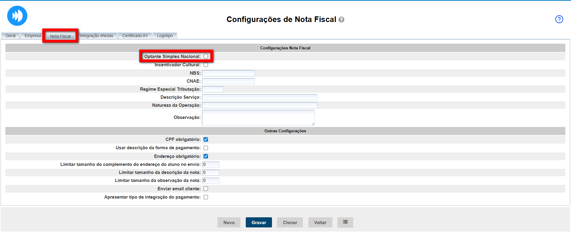 3. Irá abrir a guia "Nota Fiscal" e marcar a opção de "Optante Simples Nacional";