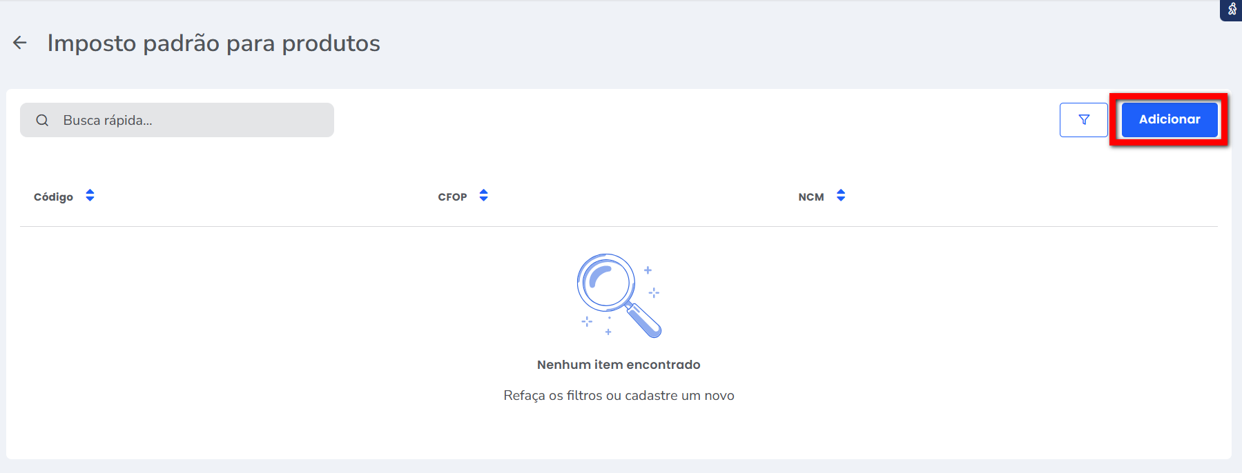 3. Em seguida será aberta a tela com os impostos já cadastrados. Para cadastrar um novo clique em "Adicionar";