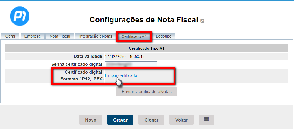 3. Na guia "Certificado A1", localize e clique sobre a opção de "Limpar certificado" para remover o certificado antigo;