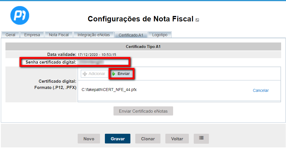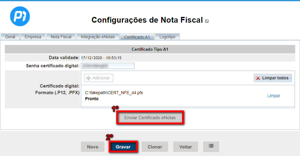 6. Em seguida, clique no botão (de cor cinza) "Enviar Certificado eNotas", e após clique no botão "Gravar";
