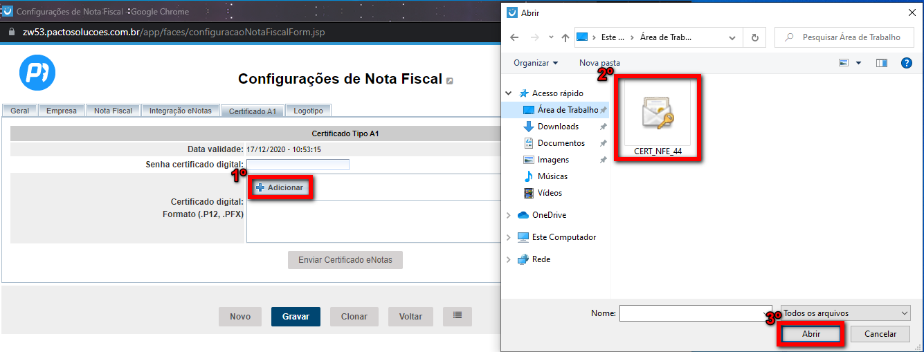 4. Após isso, clique sobre o botão "Adicionar" que serão apresentados os arquivos do seu computador. Com isso selecione o certificado de modelo A1, que deve estar no formato .P12 ou .PFX, e em seguida clique em "Abrir" para adicionar o certificado;