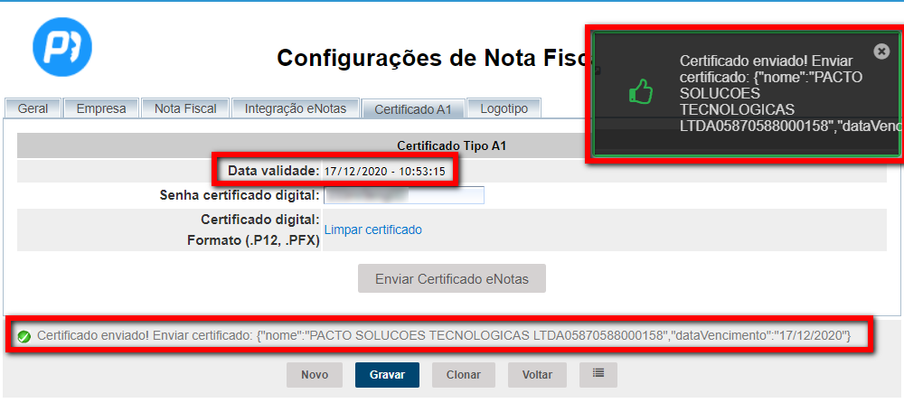 7. Para confirmar a alteração, o sistema apresenta uma mensagem informando que o certificado foi enviado, e será apresentada também a nova data de validade do certificado incluído;