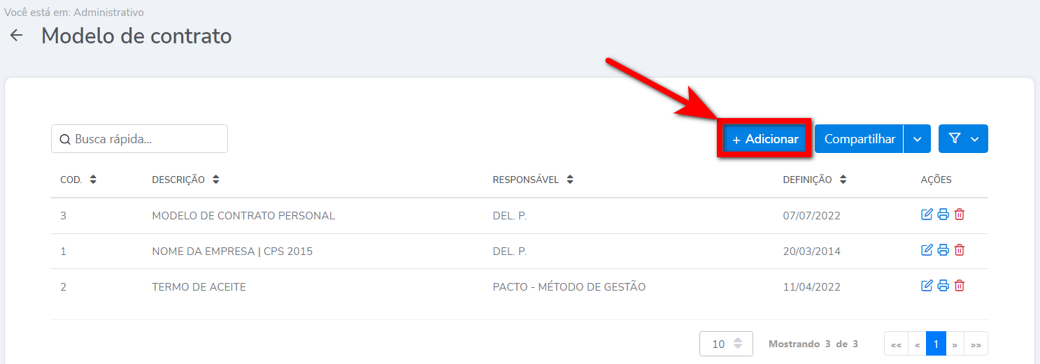 2. Será apresentada uma lista com os modelos de contratos e termos de aceite já criados. Clique no botão “Adicionar”;