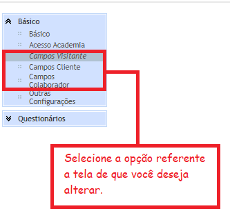 2. Na tela de configuração, do lado esquerdo, clique no menu "Básico". Ao clicar o menu ele se expande, apresentando opções de configurações. Selecione o campo que você deseja alterar: "Campos Visitante", "Campos Cliente" ou "Campos Colaborador";