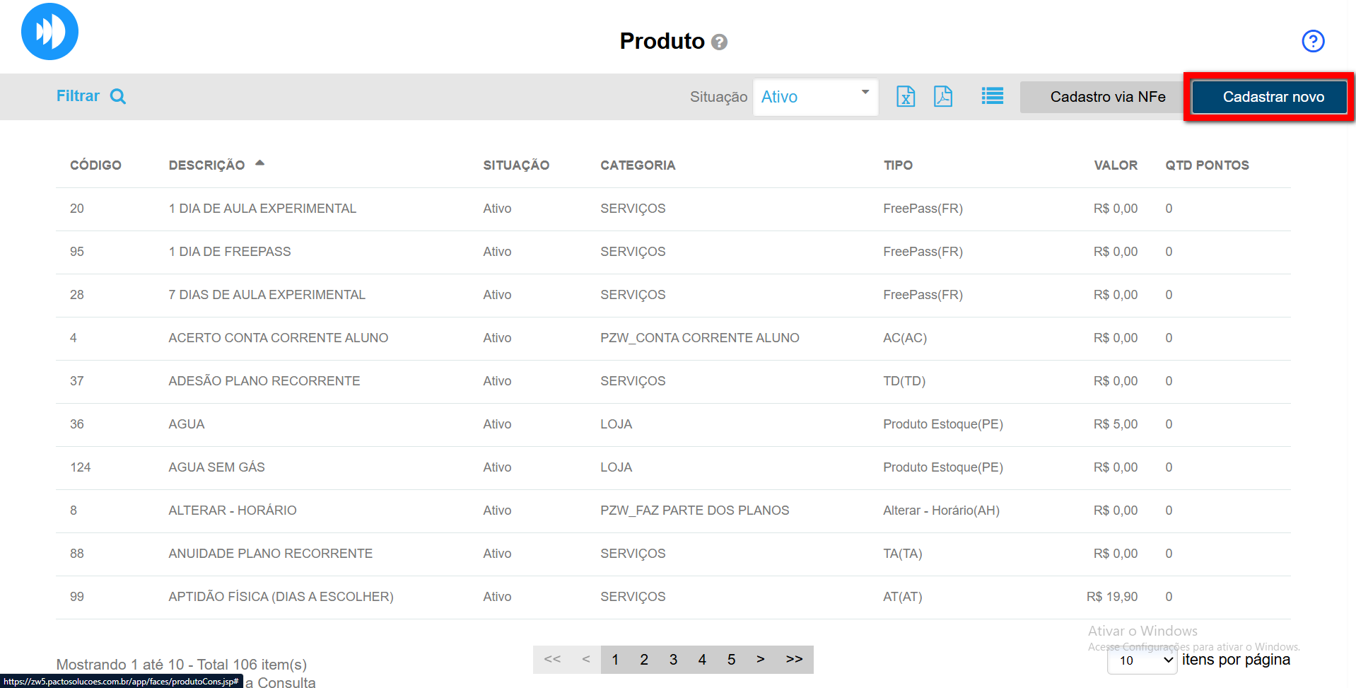 2. Será direcionado a uma nova tela contendo a lista de produtos cadastrados no sistema da empresa. Clique em "Cadastrar novo";