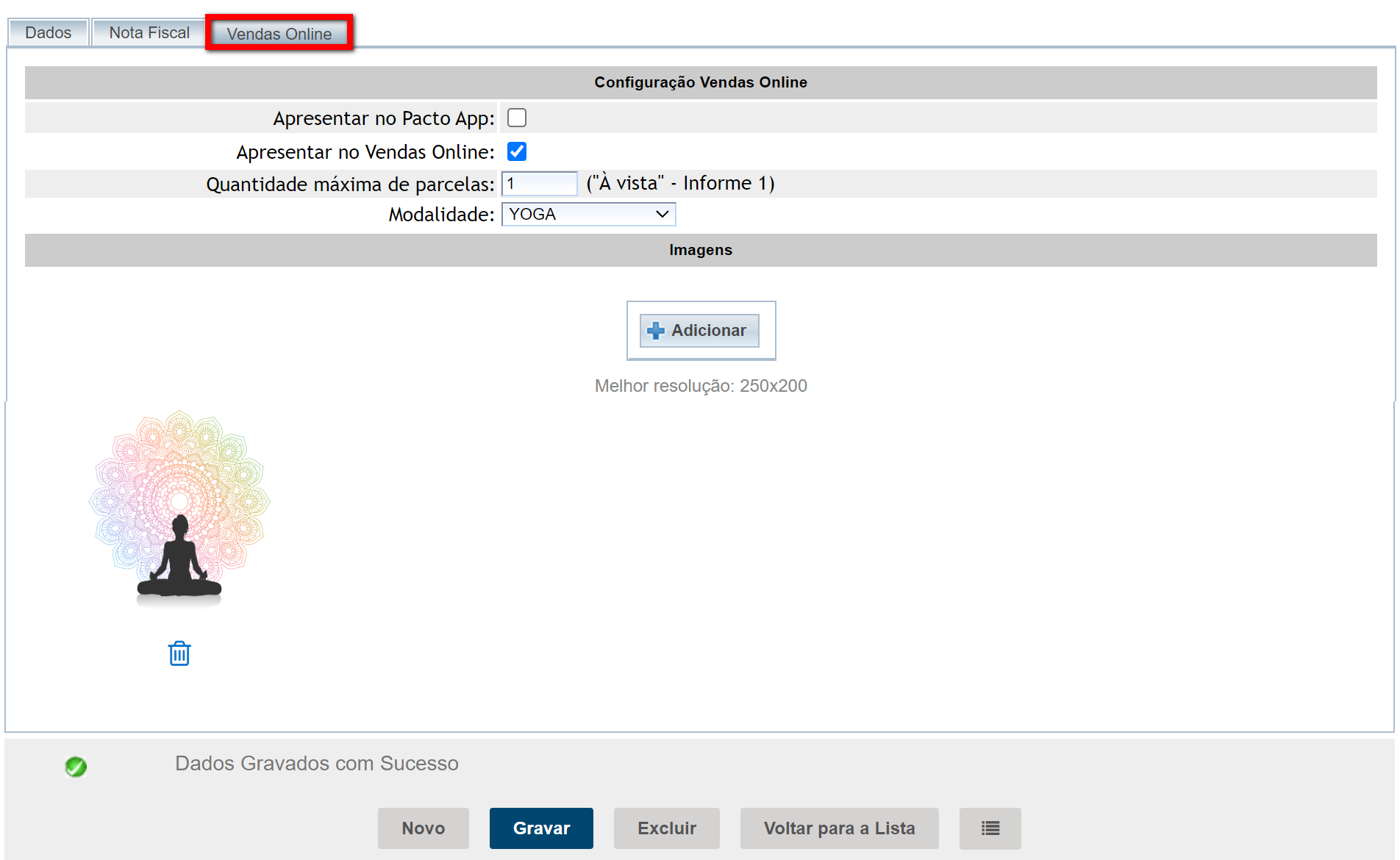 4. Ao finalizar todos os processos, clique em "Gravar". Após este processo o produto já estará disponível no site, porém para ter acesso à agenda de aulas ou turmas e reservar a vaga no ato da compra, é necessário gerar o link com o produto vinculado.