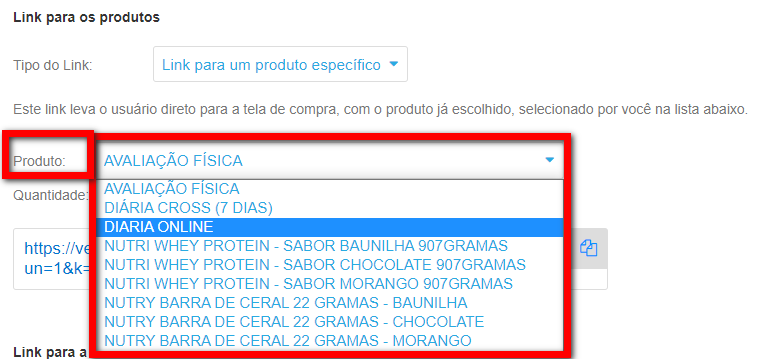 3. No campo "Tipo de Link", selecione a opção "Link para um produto específico";
