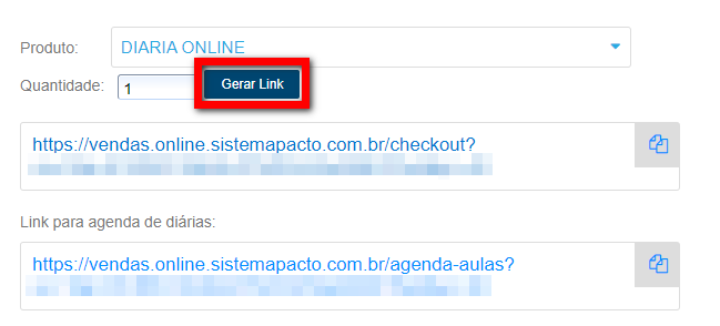 4. Identifique o campo "Produto" e selecione o produto diária, cadastrado, depois clique em "Gerar Link";