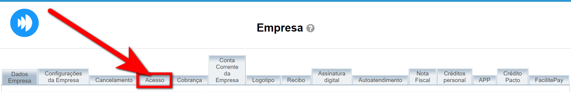 2. Será apresentada uma nova tela contendo o registro de cadastro da empresa. Clique sobre o nome da empresa para abrir seu cadastro, depois clique na guia "Acesso";