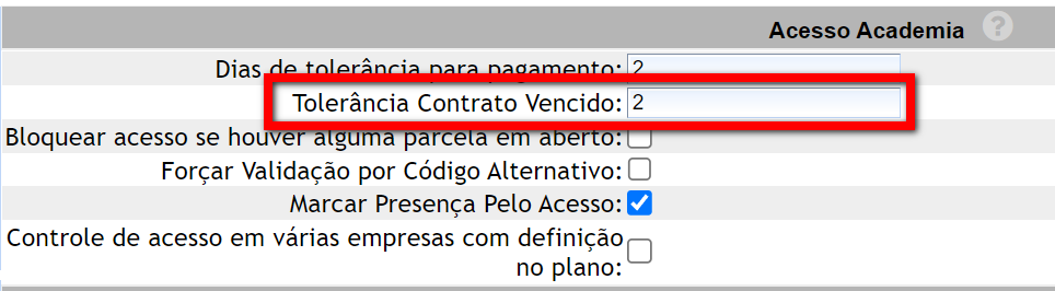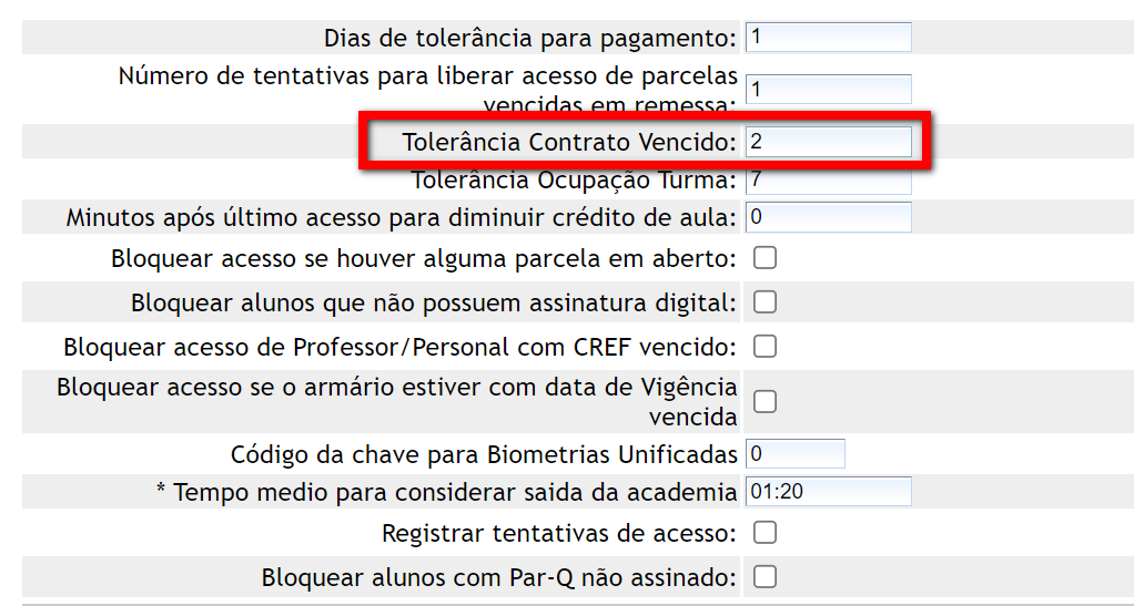 3. Após clicar na opção Acesso Academia o sistema irá abrir a página da imagem abaixo. Caso queira que o aluno seja bloqueado no próximo dia após o vencimento do contrato, basta colocar o número 0 (zero) no campo "Tolerância Contrato Vencido".