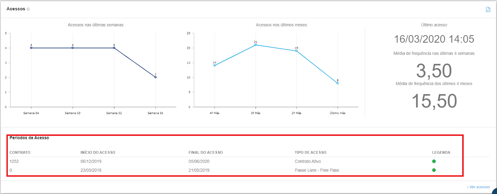 Caso seja um único aluno que está acessando a unidade após o término do contrato, acesse a tela de perfil do aluno, onde mostra as informações do plano, etc. Role até o final da página e verifique os períodos de acesso conforme a imagem abaixo.