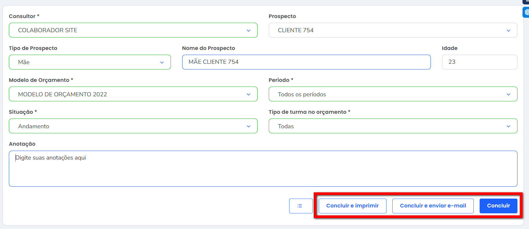 - Concluir: ao clicar, o orçamento será salvo no perfil do cliente;