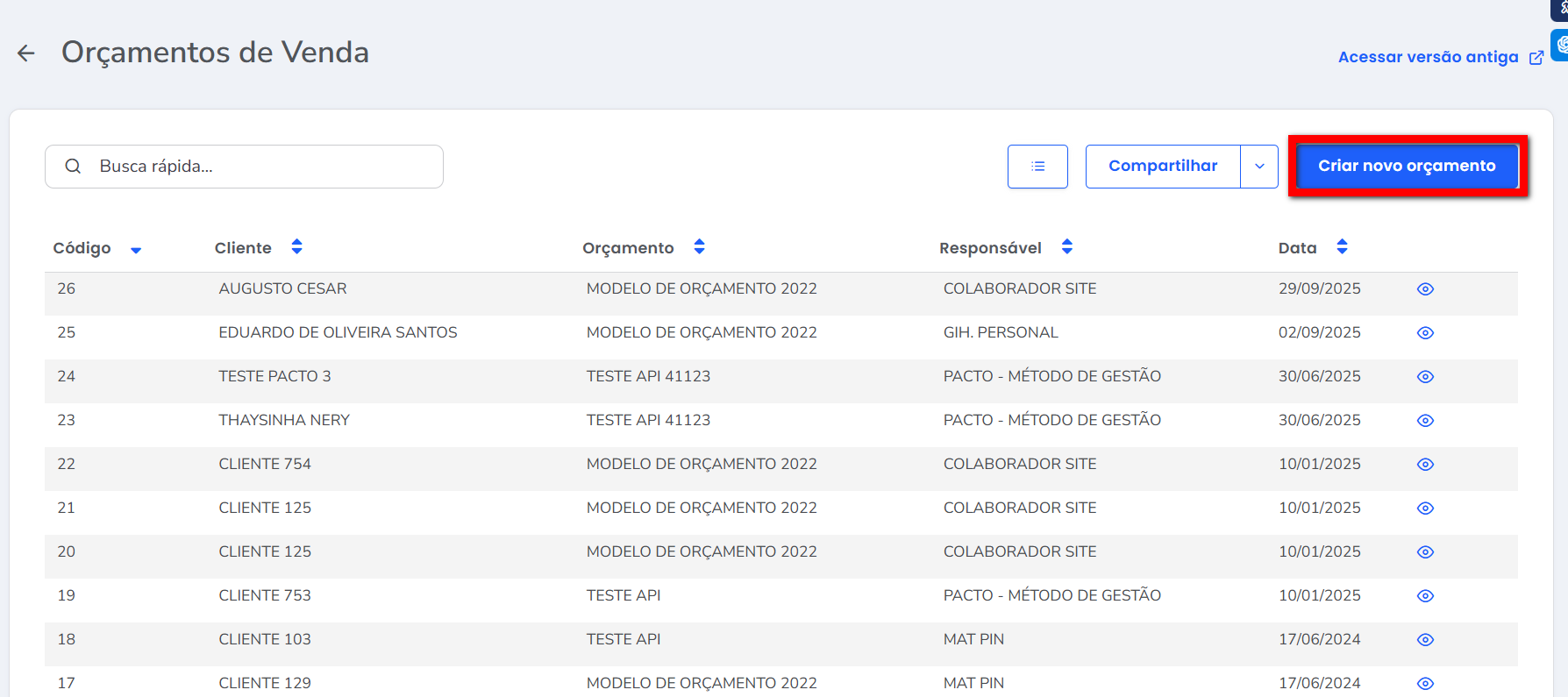 2. Na tela, localize e clique em "Criar novo orçamento";