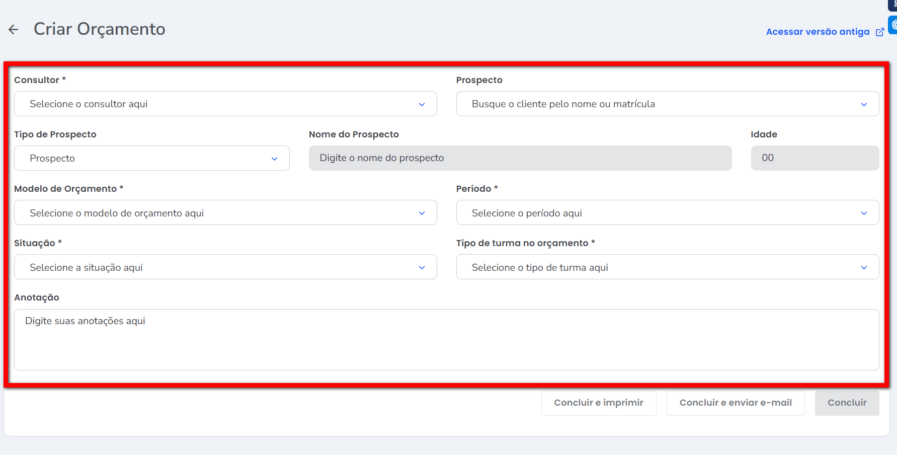3. Será direcionado à tela do orçamento onde os campos deverão ser preenchidos;