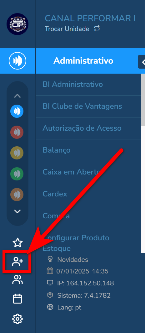 1. Acesse o módulo ADM, da empresa que deseja transferir o cliente, e no menu lateral clique no ícone para "Incluir cliente";