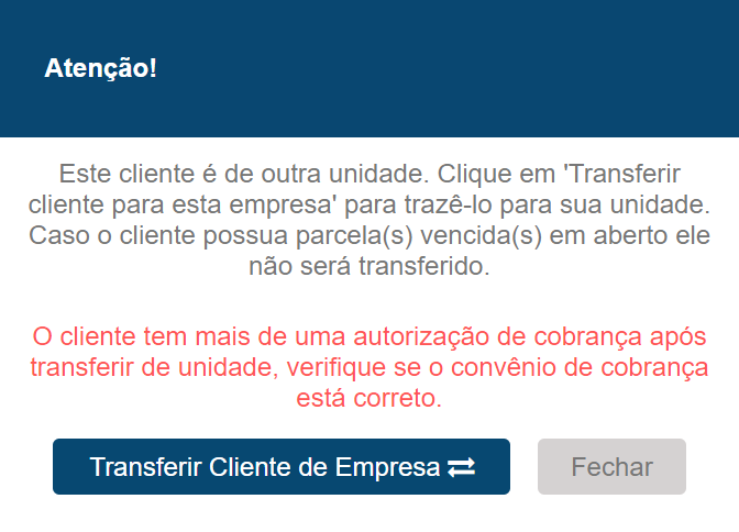 Caso o aluno possua mais de um convênio de cobrança configurado, e na unidade que irá receber a transferência possua convênios de cobranças configurados, será apresentada a mensagem. "O cliente tem mais de uma autorização de cobrança após transferir de unidade, verifique se o convênio de cobrança está correto.". Observação: caso clique em "Transferir Cliente de Empresa" é necessário acessar o perfil do aluno para verificar se o convênio de cobrança alterado está correto, e caso não esteja realize o ajuste para o convênio correto