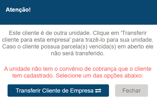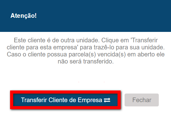 4. Será apresentado um pop-up, com a mensagem padrão, “Este cliente é de outra unidade. Clique em 'Transferir cliente para esta empresa' para trazê-lo para sua unidade. Caso o cliente possua parcela(s) vencida(s) em aberto ele não será transferido”. Aqui existem alguns cenários onde podem apresentar outra mensagem abaixo da padrão de transferência;
