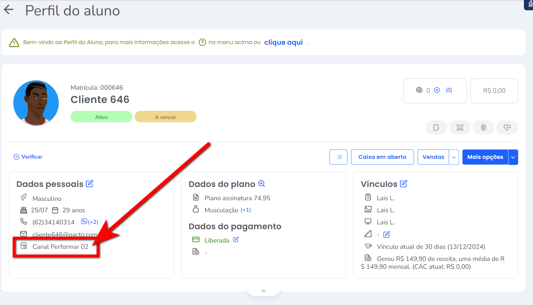 5. Feito isso, cliente será transferido de unidade, e na tela inicial do seu perfil, é possível validar a operação conferindo a unidade no campo "Empresa".