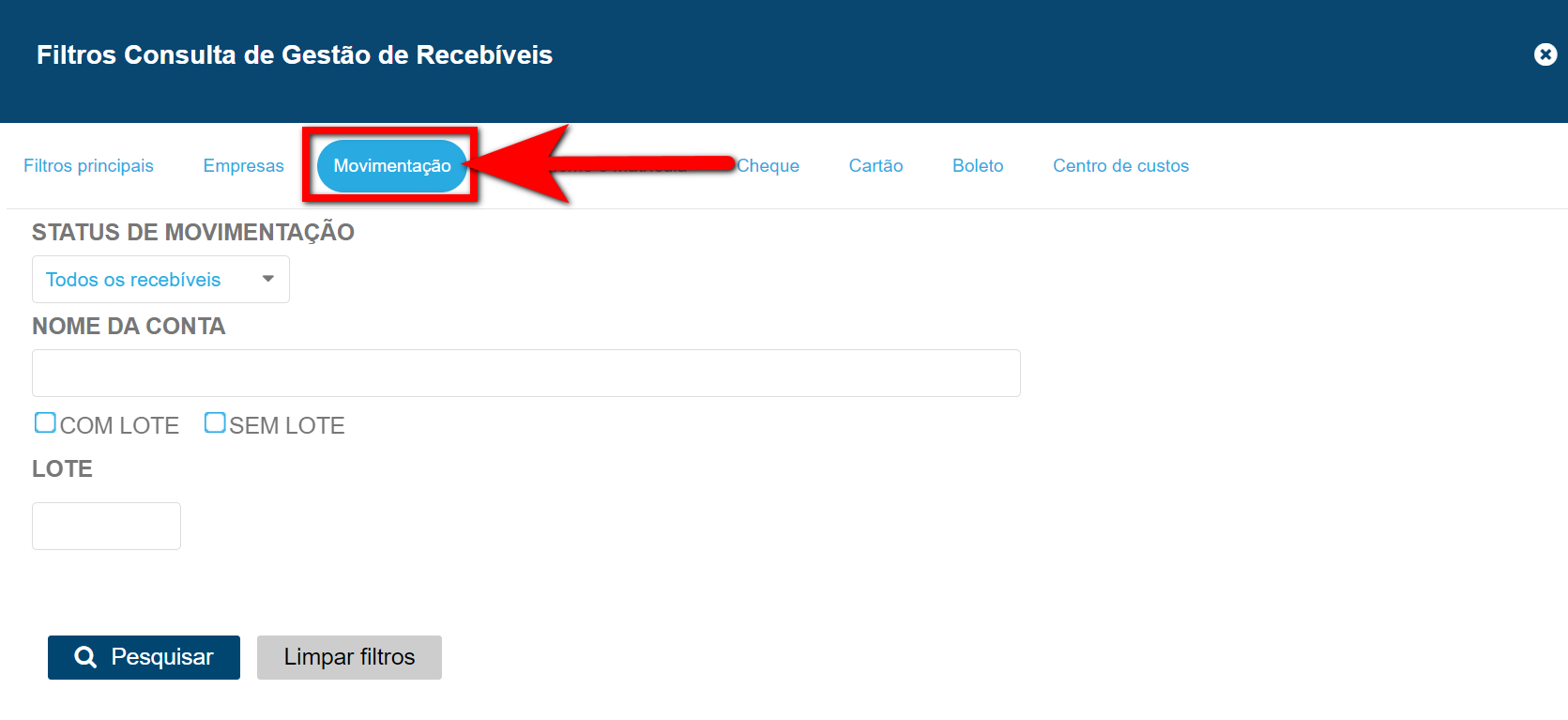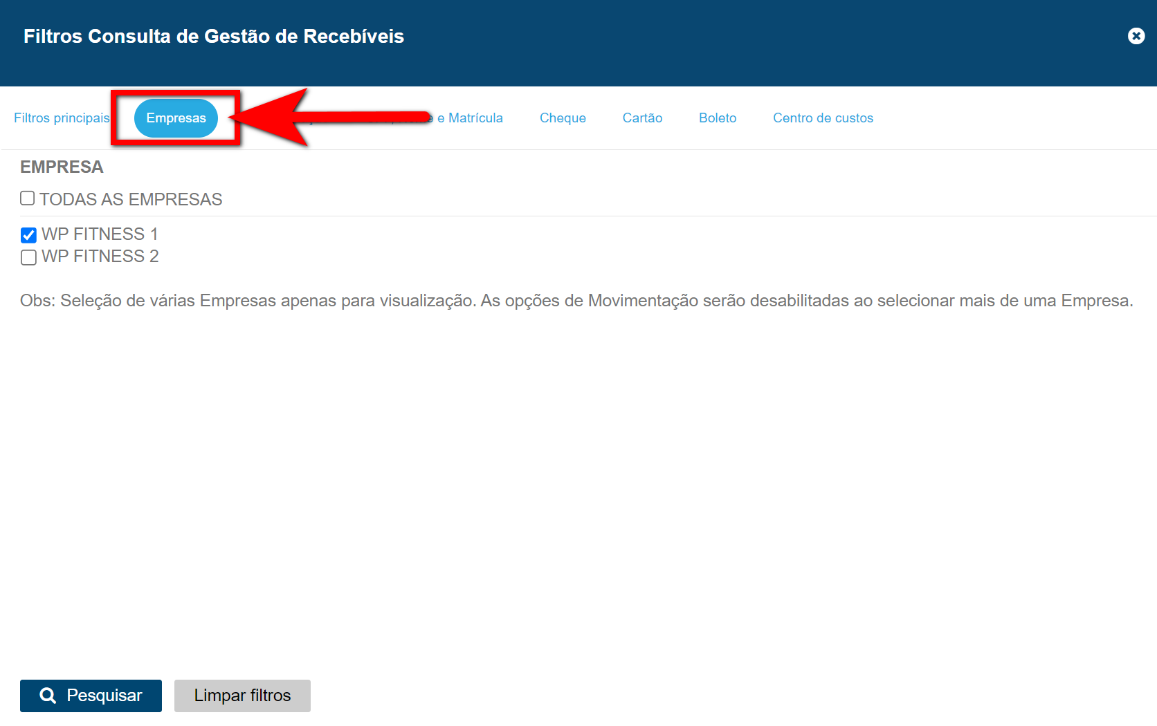 Empresas Neste filtro marque a unidade que deseja localizar os recebíveis;