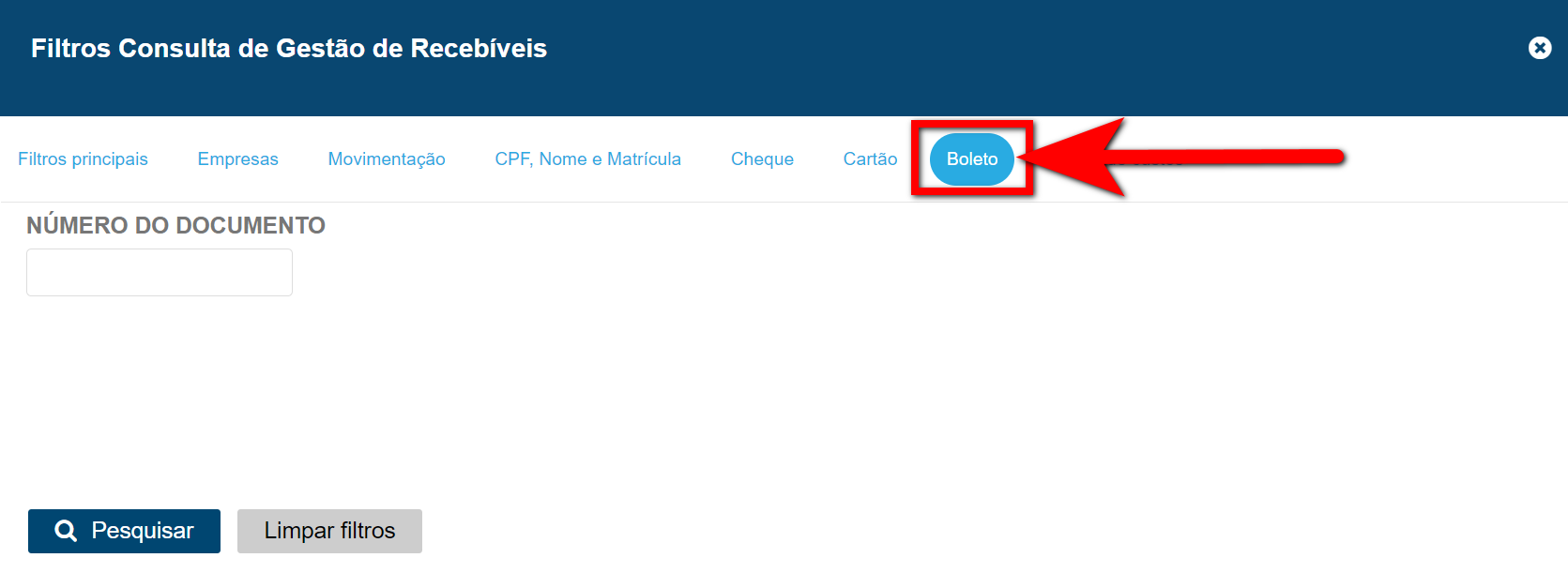 - Número do documento: informe o número do "Boleto PJBank" que deseja localizar.