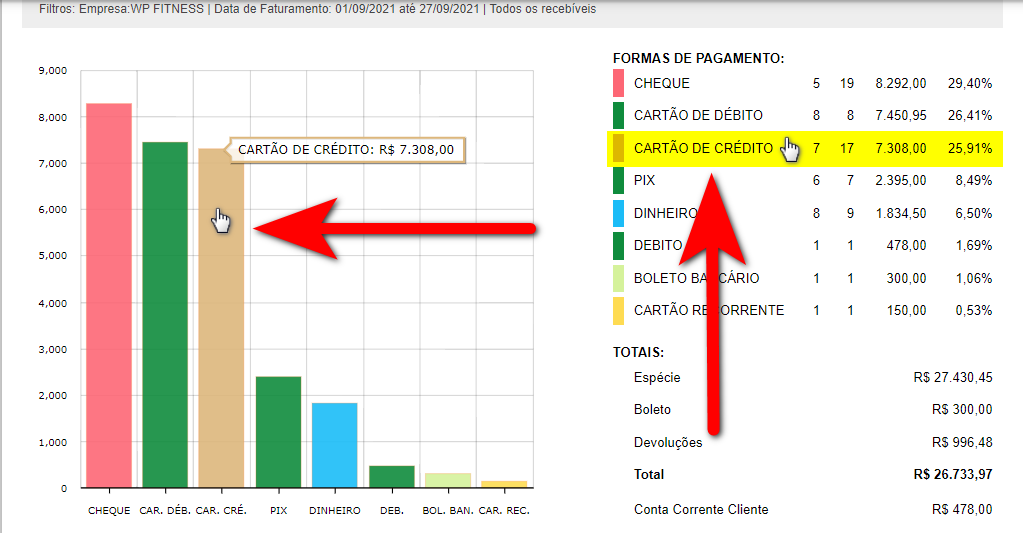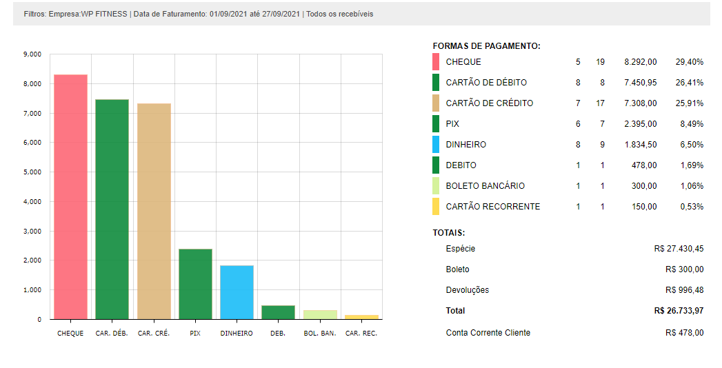3. Após aplicar os filtros desejados, será apresentado um gráfico indicando o valor recebido separado por cada forma de pagamento;