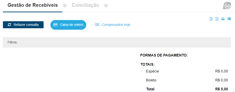 - Caixa de ontem: ao clicar neste filtro, será apresentado dados referentes ao faturamento recebido do dia anterior, ou seja, todas as parcelas que deram baixa no caixa em aberto no dia anterior;