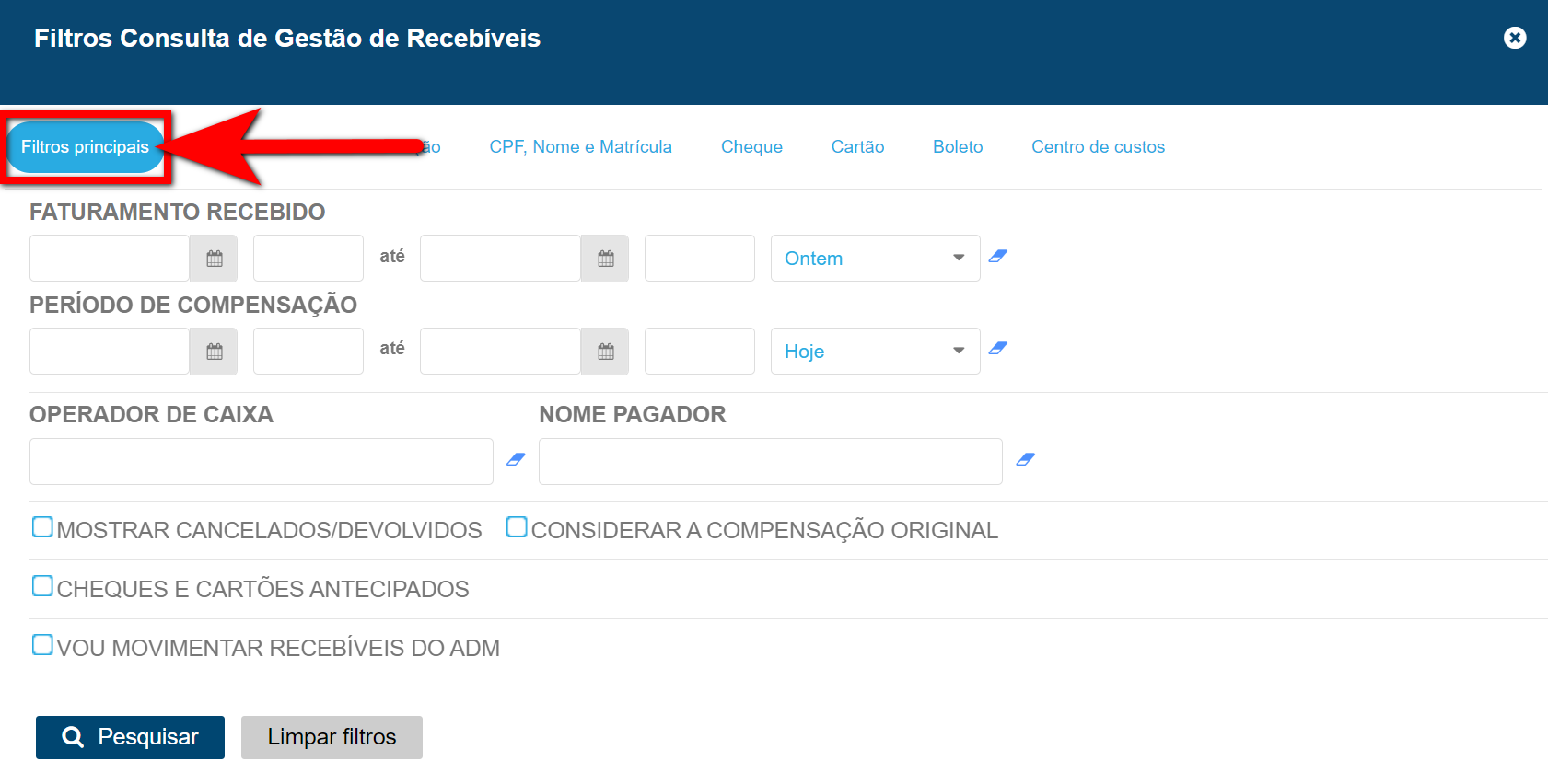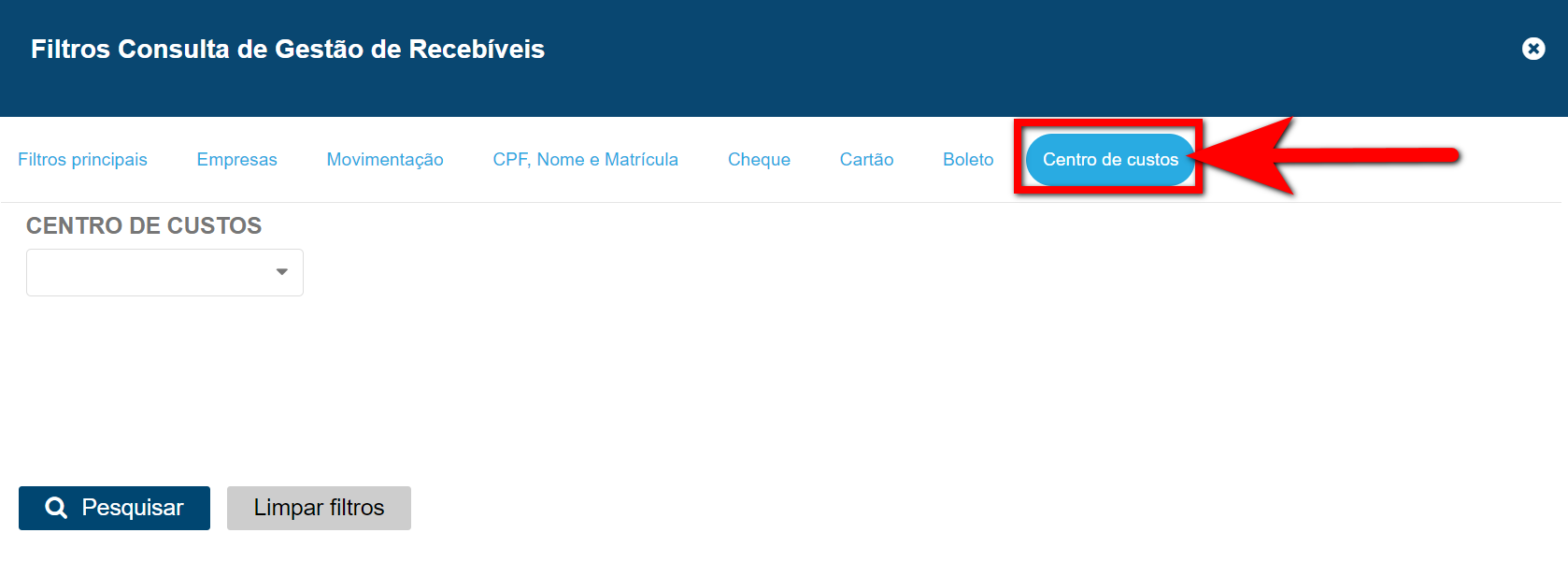 - Centro de Custos: caso queira visualizar recebíveis associados a um determinado centro de custos, selecione-o neste campo.
