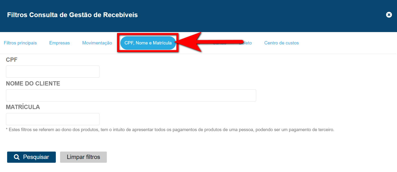 - Matrícula: caso deseje analisar todos os recebíveis de um determinado cliente, basta informar sua matrícula neste campo.