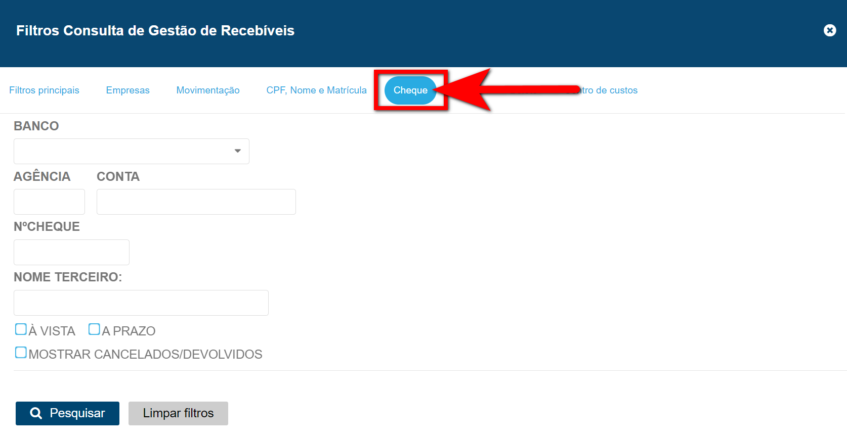 - À Vista: ao marcar esta opção será apresentado na sua busca apenas cheques que foram lançados à vista;