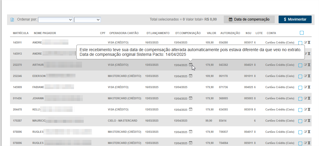 4.4. Se a data de compensação de um recebimento for alterada automaticamente ou manualmente, este novo ícone será exibido . Para conferir a data de compensação original, basta passar o mouse sobre ele.