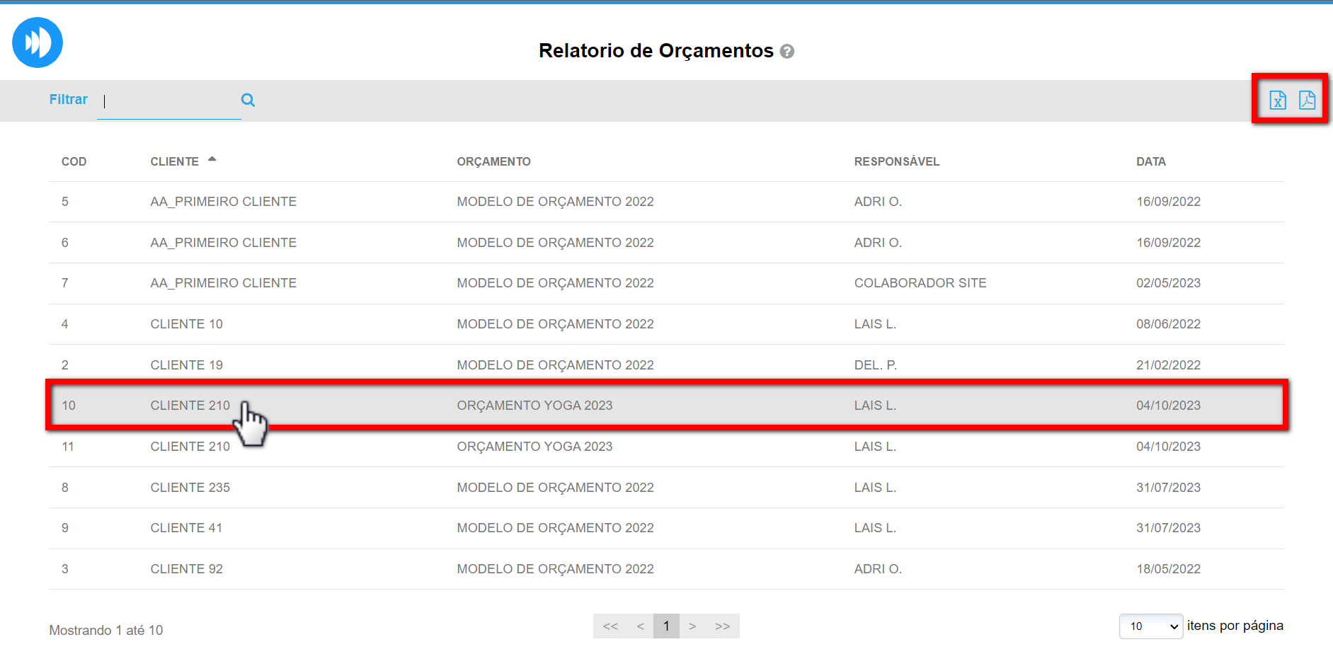 2. Logo já é apresentada a tela contendo a listagem de orçamentos realizados anteriormente. Clique no ícone para baixar a listagem em Excel ou no ícone