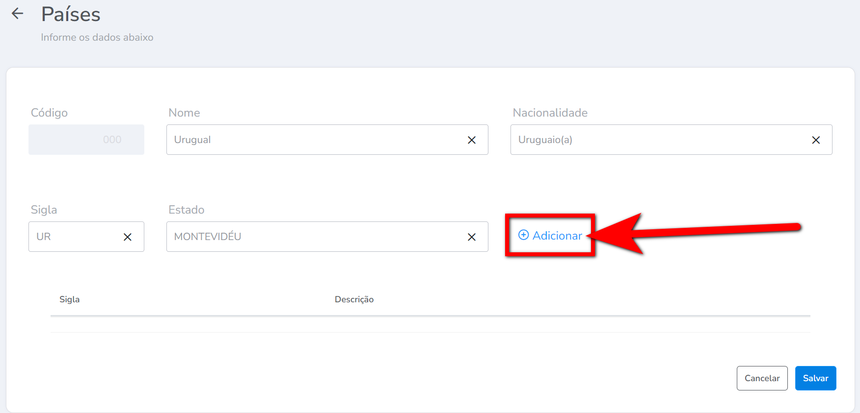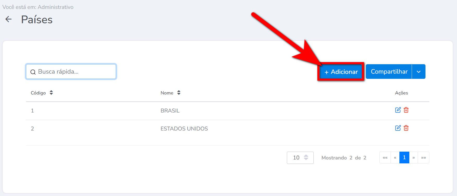 2. Será direcionado a uma nova tela, exibindo o registro de todos os países cadastrados no sistema. Clique em “+ Adicionar“;