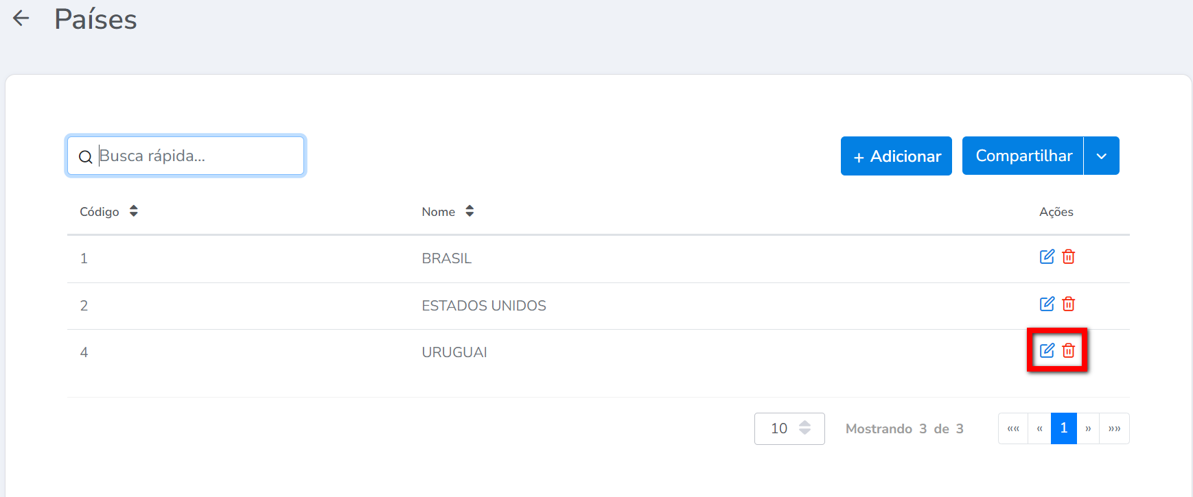 5. Caso deseje editar algum País clique no ícone , caso deseje excluir clique no ícone
