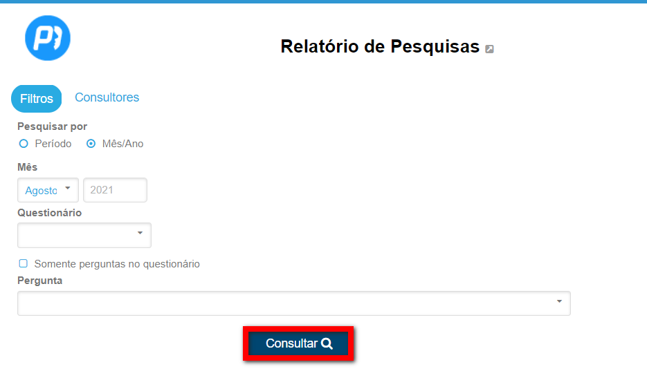 2. Após acessar, o sistema mostrará alguns filtros para realizar a consulta, e também permite selecionar por consultores específicos. Aplique os filtros desejados e clique em "Consultar".