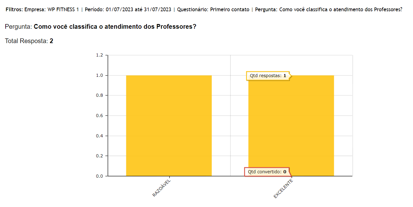 1. Abaixo será apresentado o resultado da pesquisa, contendo o total de respostas em forma de gráfico. Ao passar o mouse por cima do gráfico, o sistema apresenta a quantidade de respostas e a quantidade de convertidos;
