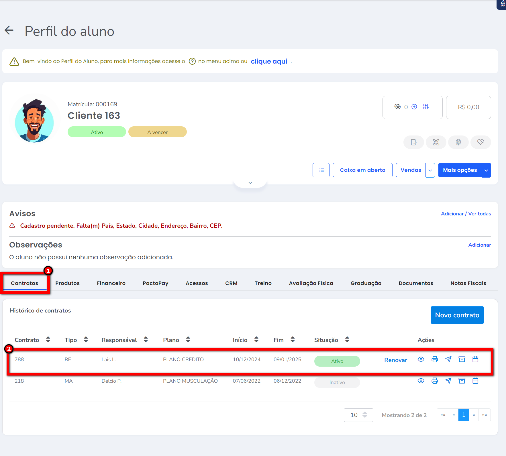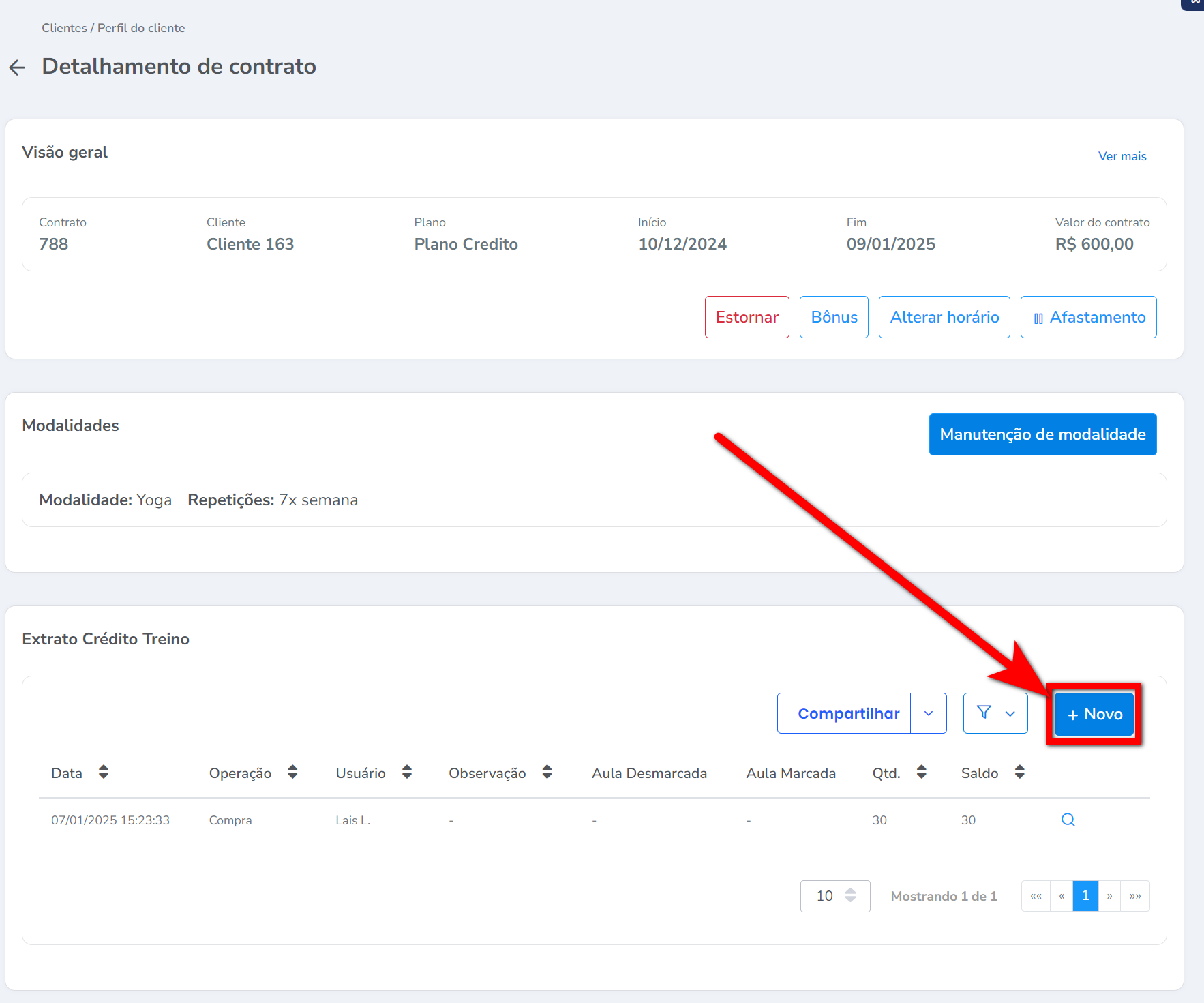 5. Pronto, o saldo de crédito do seu aluno foi ajustado, e poderá conferir nos detalhes do contrato do cliente o novo saldo.