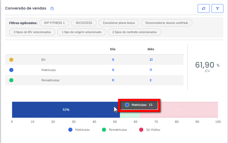 - Matrículas: apresenta a quantidade de visitantes que se matricularam, onde no campo "Dia" representa as visitas do dia pesquisado e "Mês" representa as matrículas do dia 01 do mês corrente, até o dia pesquisado;