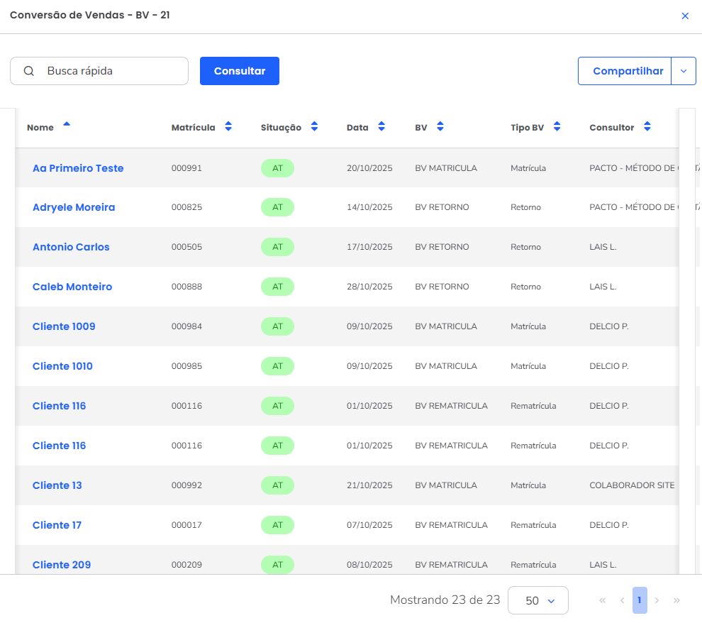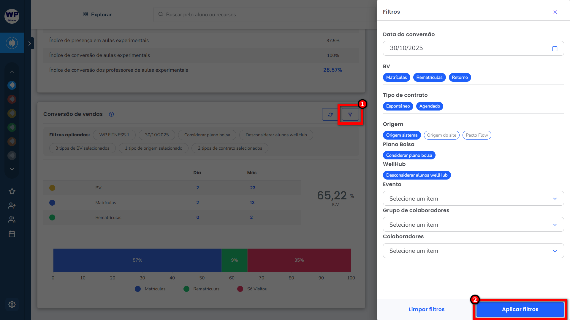 2.2. Ao lado, a porcentagem apresentada é baseada no seguinte calculo: número de vendas (Matrículas + Rematrículas) dividido pelo número de BV's preenchidos e multiplicado por 100;