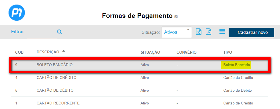 2. Será apresentado uma nova página, listando todas as formas de pagamento cadastrados na empresa. Localize a forma que está configurada com o tipo "Boleto Bancário" e clique nela;