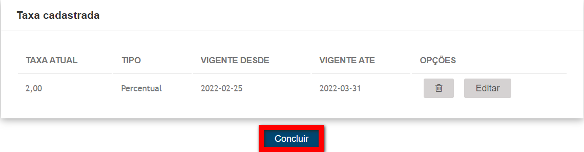 - Vigência Final: informe neste campo, até que data esta taxa estará ativa (o indicado é preencher este campo com a data que o banco repassou).