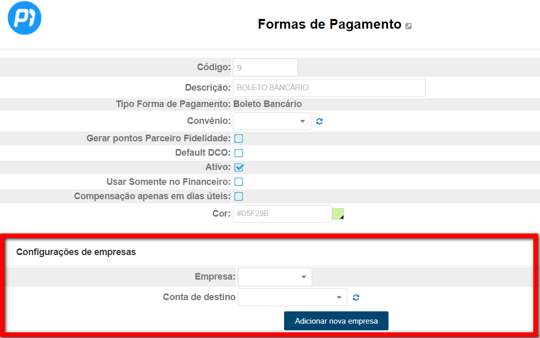3. Na tela de cadastro da forma de pagamento, identifique o campo "Configurações de empresas" e preencha os campos exibidos, depois clique no botão "Adicionar nova empresa";