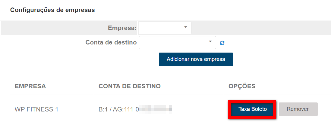 - Empresa: selecione neste campo a unidade que deseja vincular o cadastro da taxa de boleto;