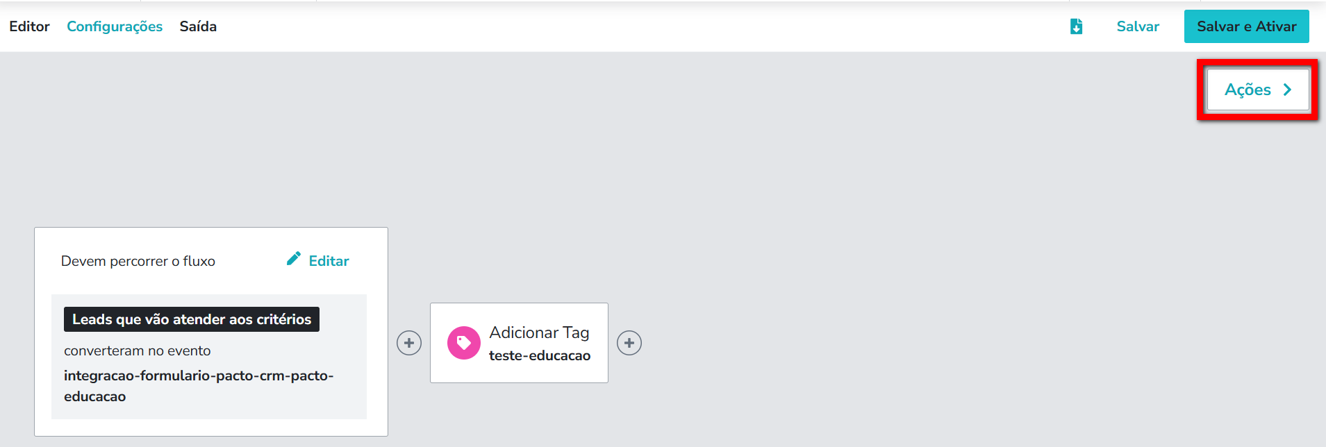 8.4. Na tela do fluxo para adicionar a automação desejada clique em "Ações";