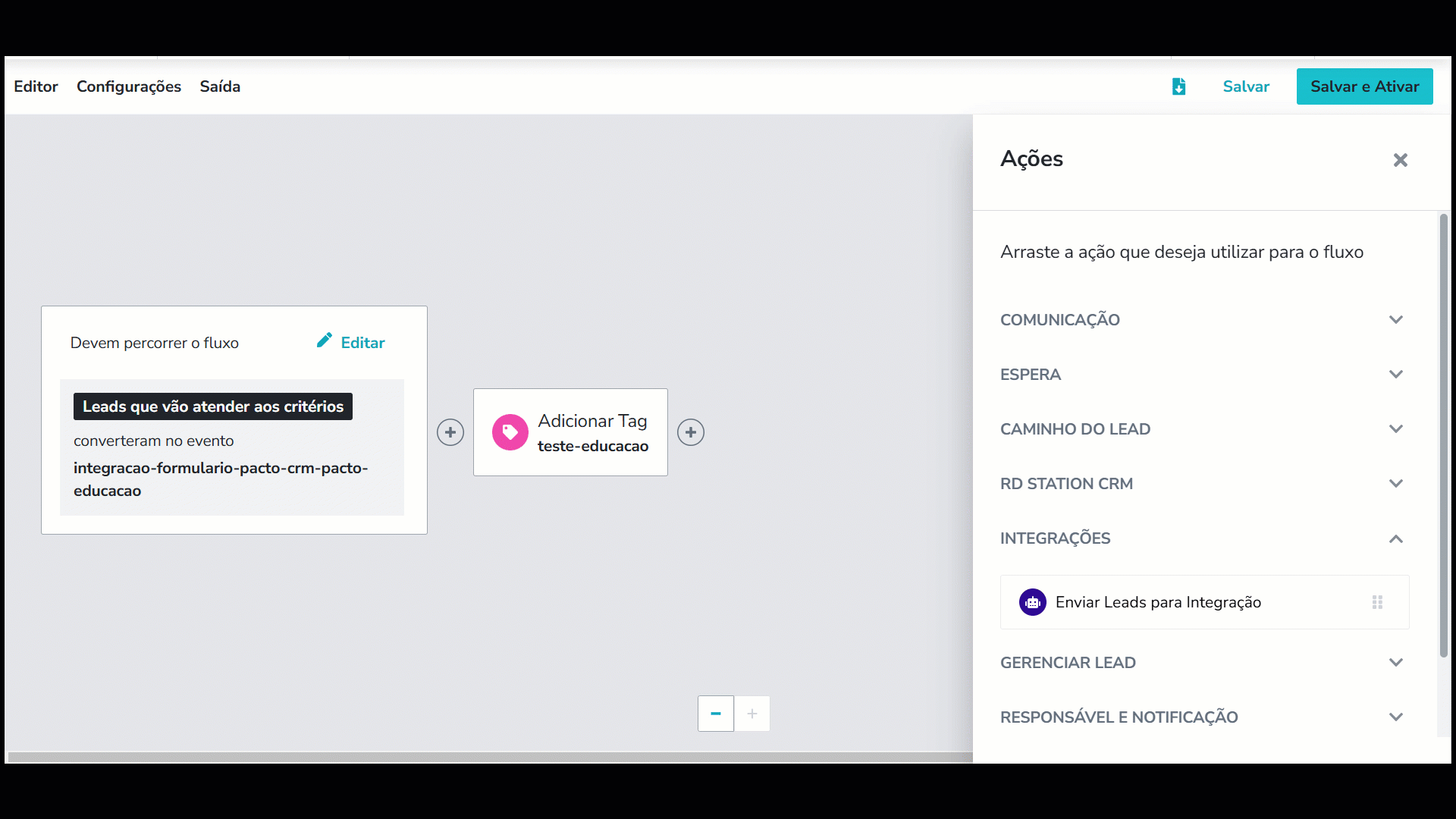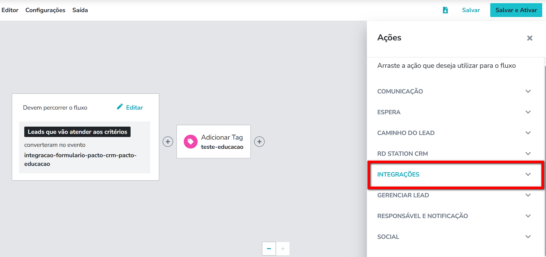 8.8. Salve as alterações realizadas do seu Fluxo de Automação. A partir desse momento, todos os leads que chegarem na etapa criada no fluxo, serão automaticamente enviados para o PACTO CRM.