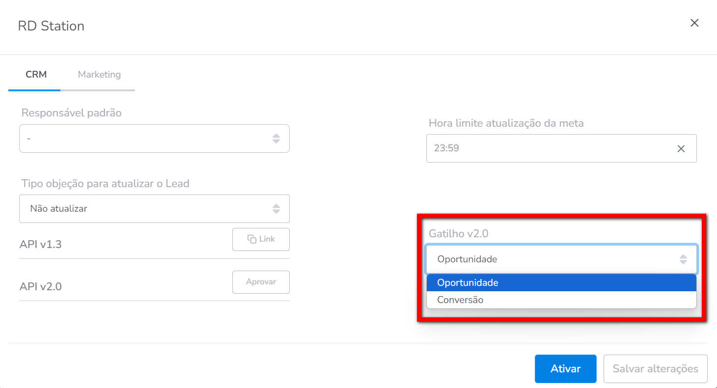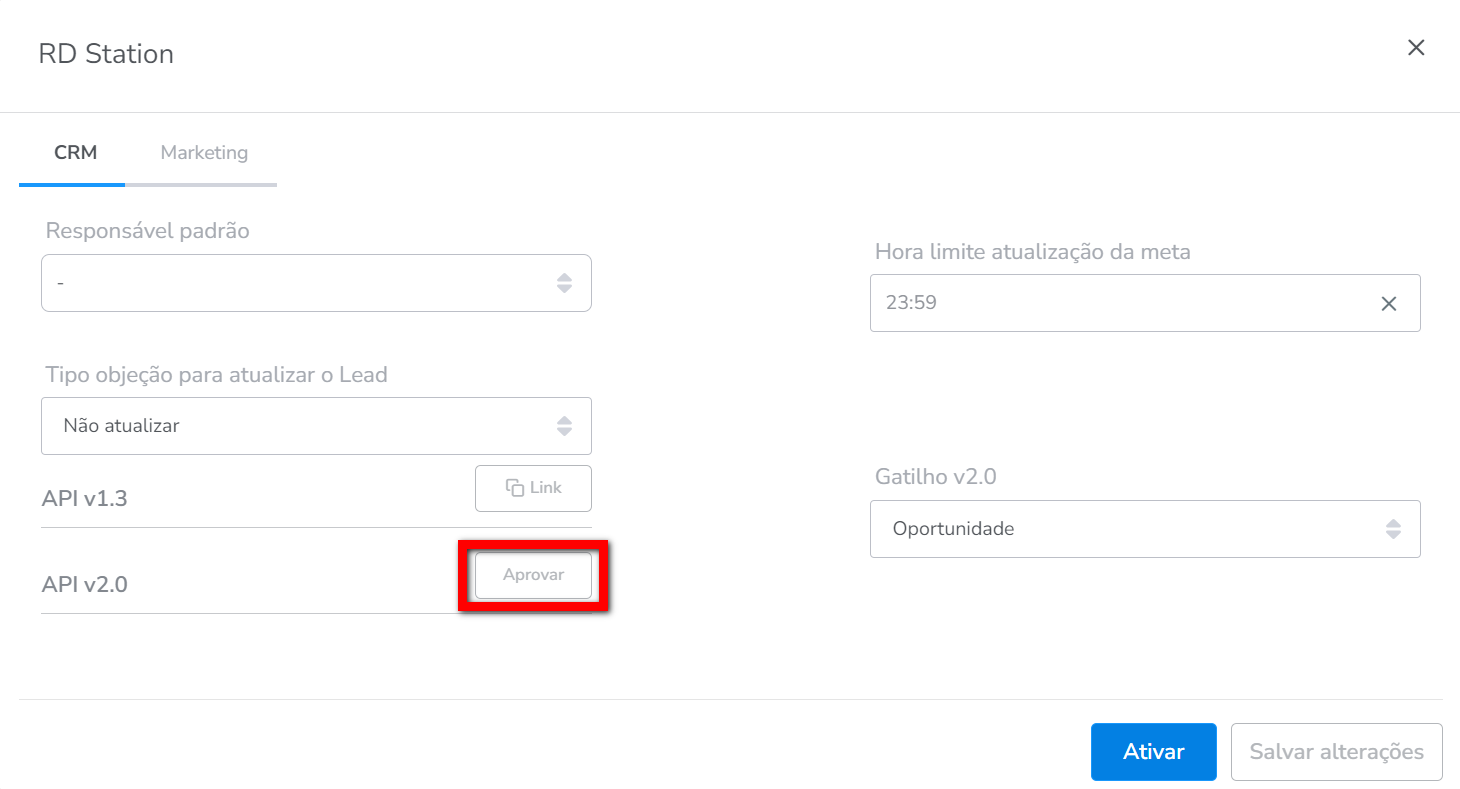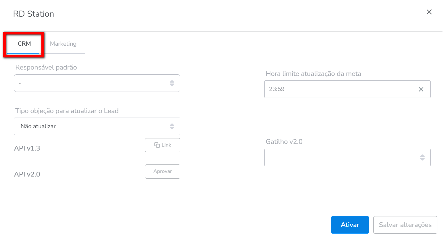 5. Em seguida, na guia "CRM" preencha os campos para a integração;