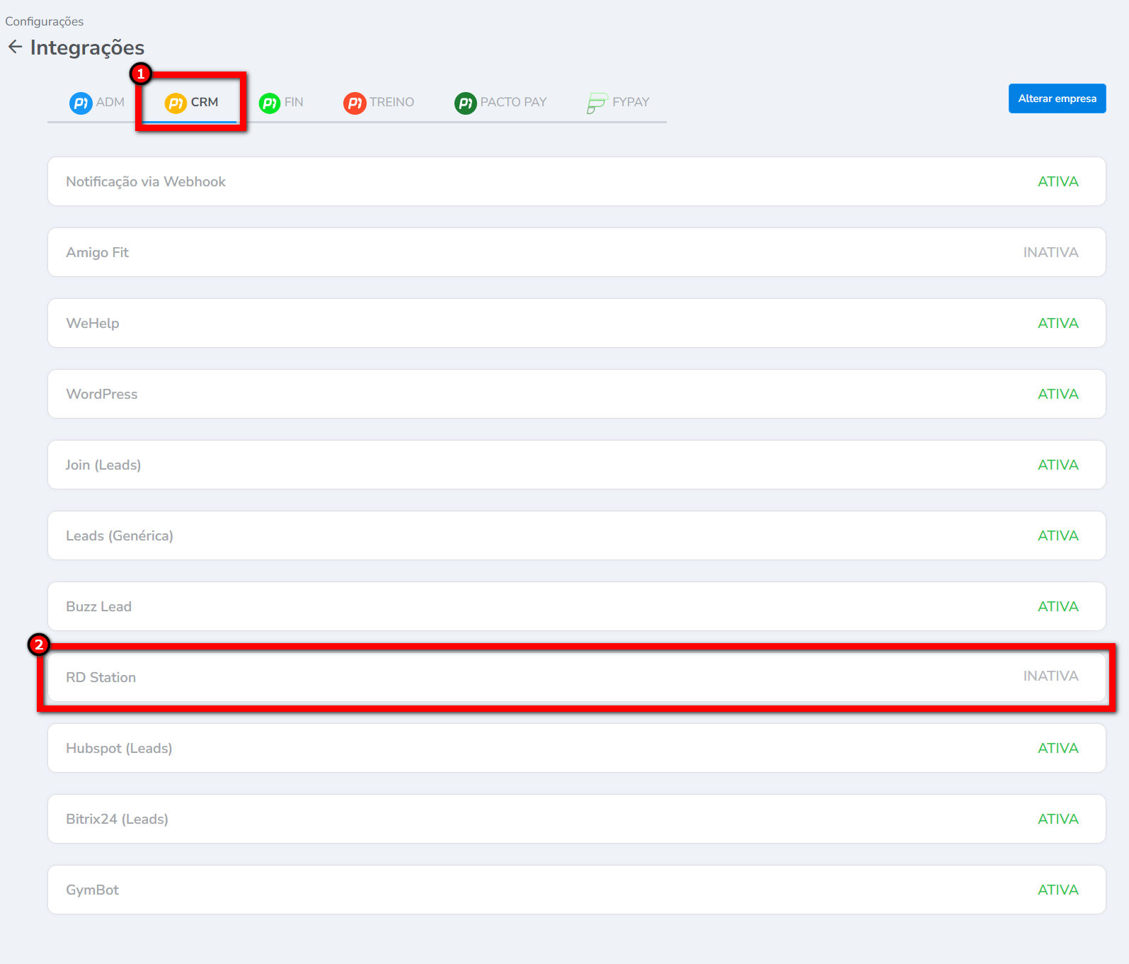 4. Será apresentada a tela de Integrações de todos os módulos do sistema Pacto. Clique no módulo CRM apresentado na tela e selecione a integração “RD Station“;