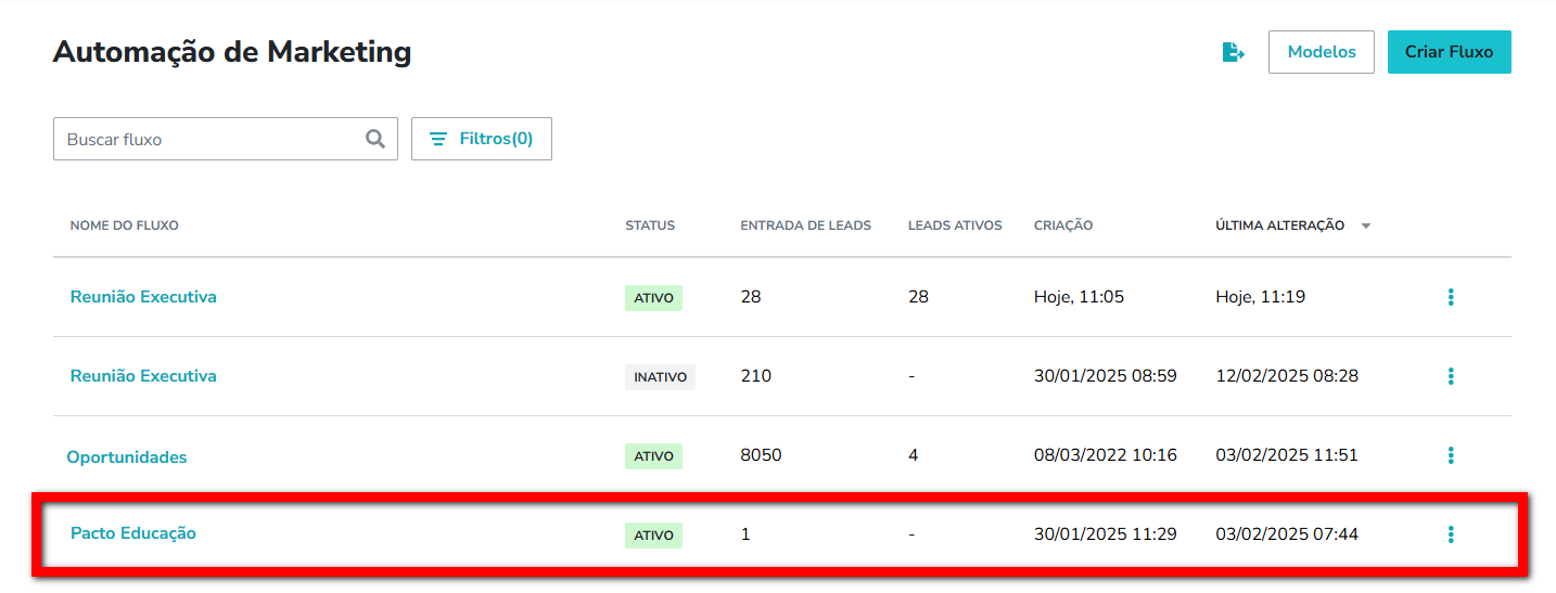 8.2. Será apresentado a tela com as automações já cadastrada. Clique sobre a automação desejada ou clique em "Criar Fluxo" para cadastrar uma nova automação;