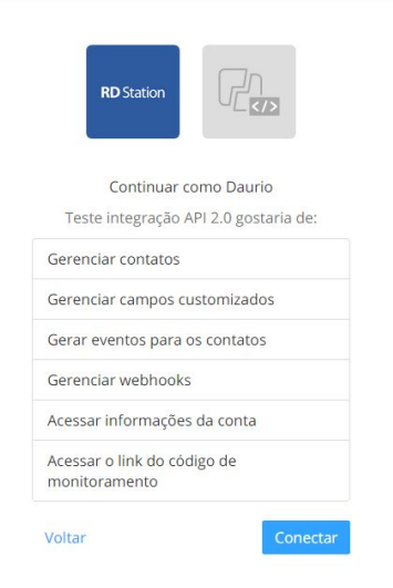 9.4. Logo após clique em “Conectar” na tela acima. O usuário não deve fazer nada além dessa ação, se a configuração estiver correta, esta nova janela será fechada. URL WebHook para APIs 2.0: O sistema pacto, após conectar a integração, a URL do webhook será adicionada de forma automática em sua plataforma RD;