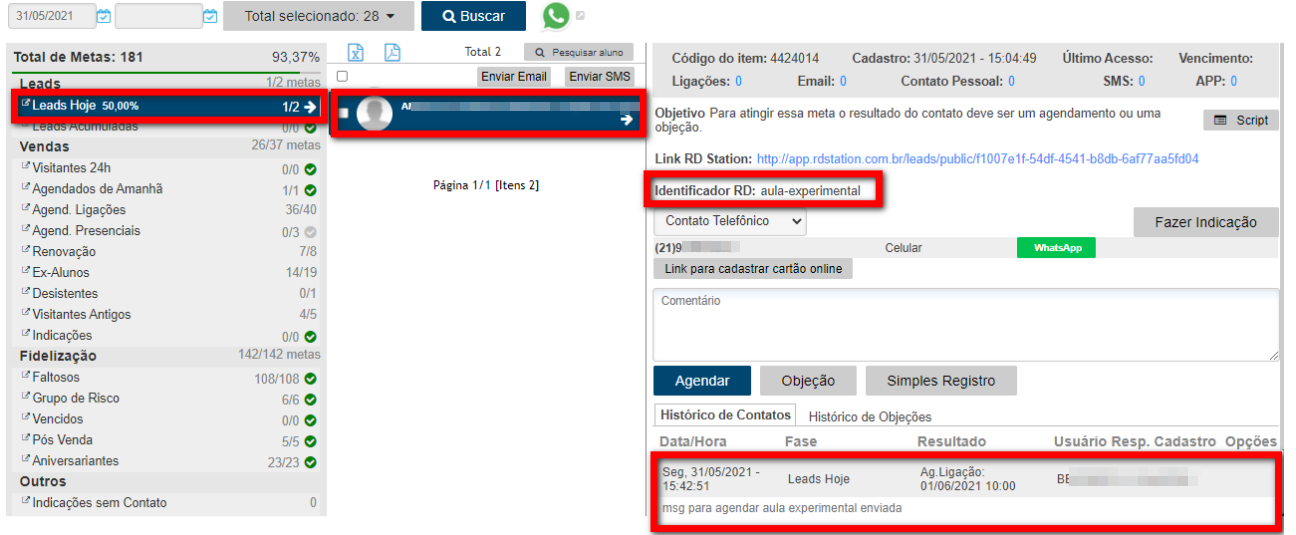 9.5. No Pacto CRM, você poderá visualizar a conversão mais recente registrada no histórico do RD, de forma bem simplificada, no campo “Identificador RD”. Neste exemplo foi realizado o contato e registrado um agendamento de aula experimental, com isso o Identificador RD é o aula-experimental.