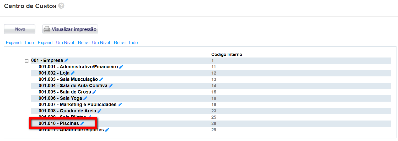 2. Ao acessar o recurso, localize o centro de custos que deseja editar. 3. Clique no ícone